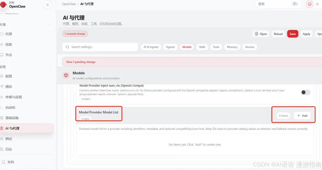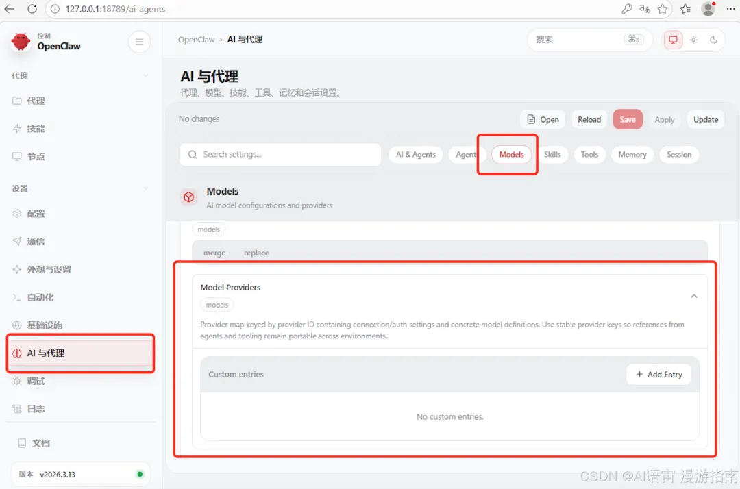 回去打开 http://127.0.0.1:18789,点左边的"AI 与代理" → "Models",拉到底点"Add entry"。