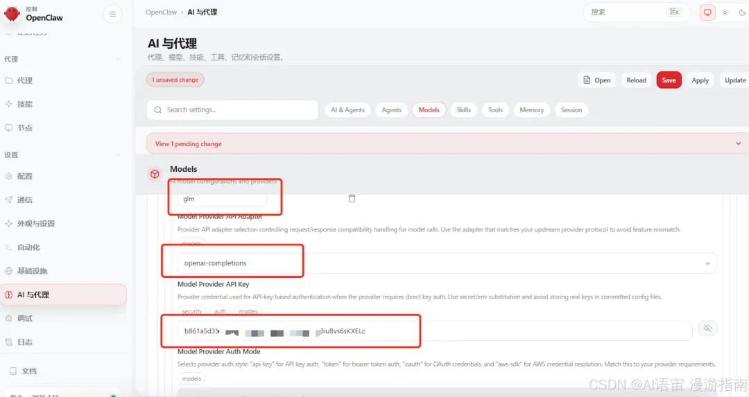 • 名称: glm• 访问方式: openai-completions• API Key:填刚才智谱给你的