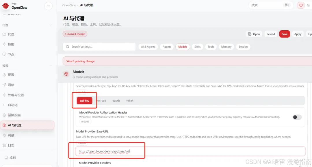 • 类型: api-key• URL:填智谱的访问路径(只复制到 /v4,后面的别复制)