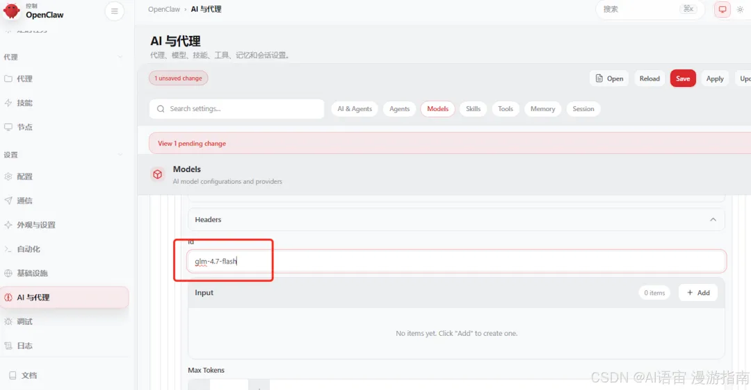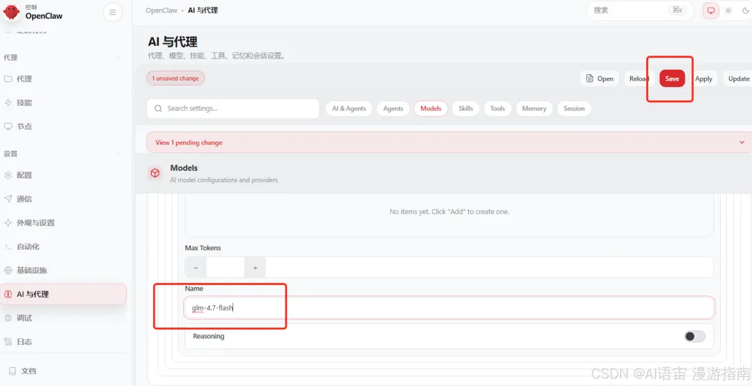 • 名称: glm-4.7-flash,然后点击右上角保存