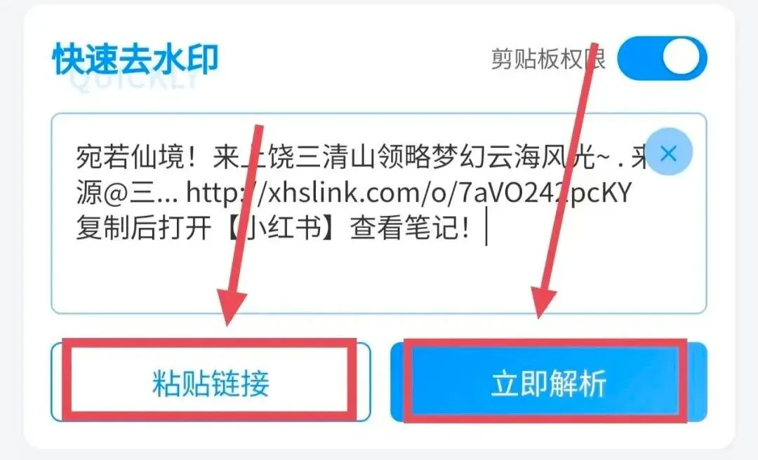 打开事先找好的去水印小程序,只要你进去,通常就会自动读取粘贴板,把你复制的链接读取到输入框。如果没有自动读取,只要点击粘贴到输入框,点击立即解析就行。