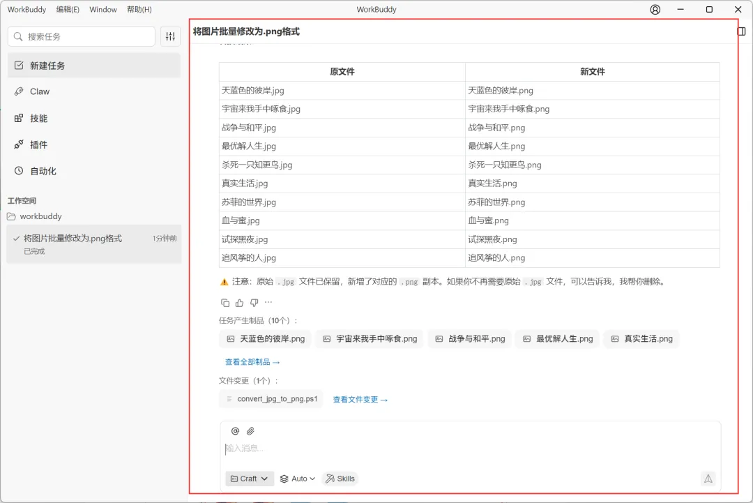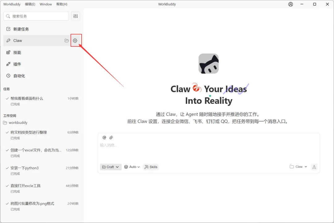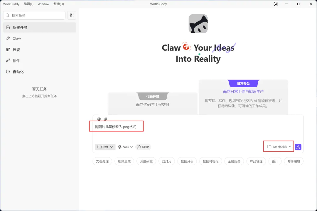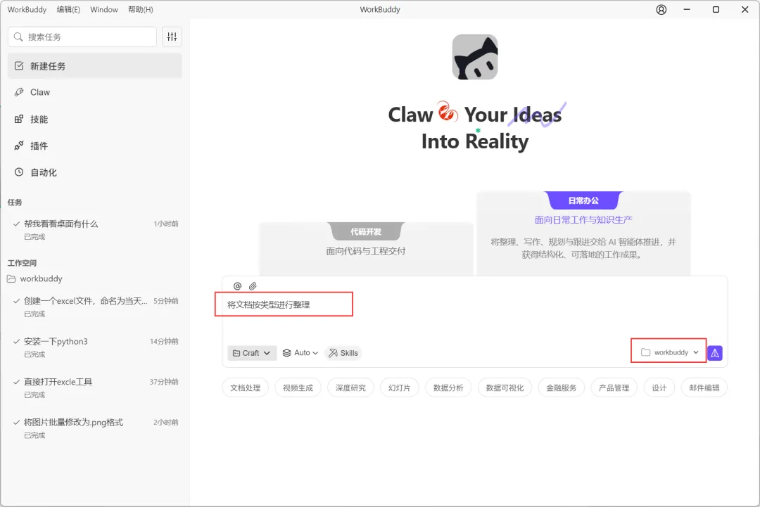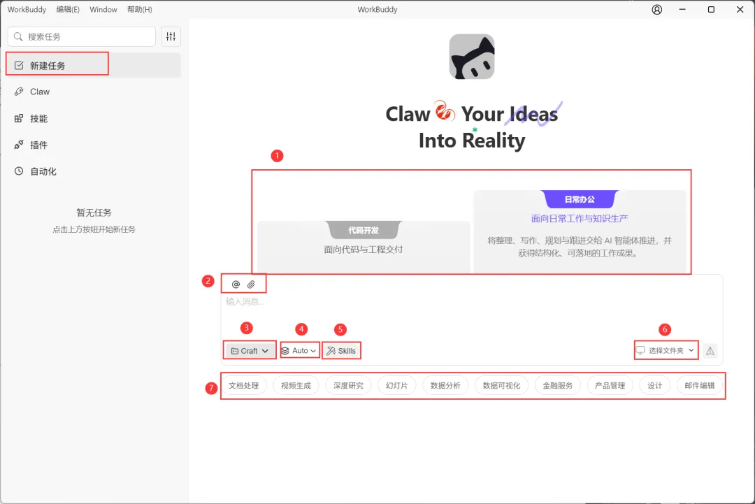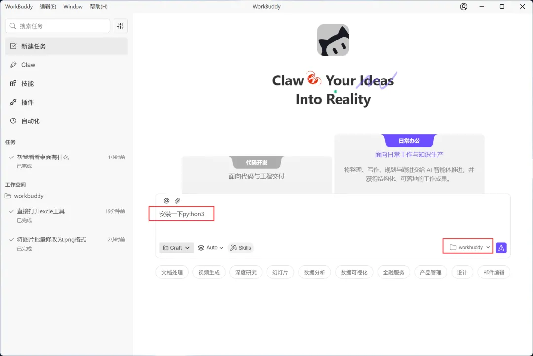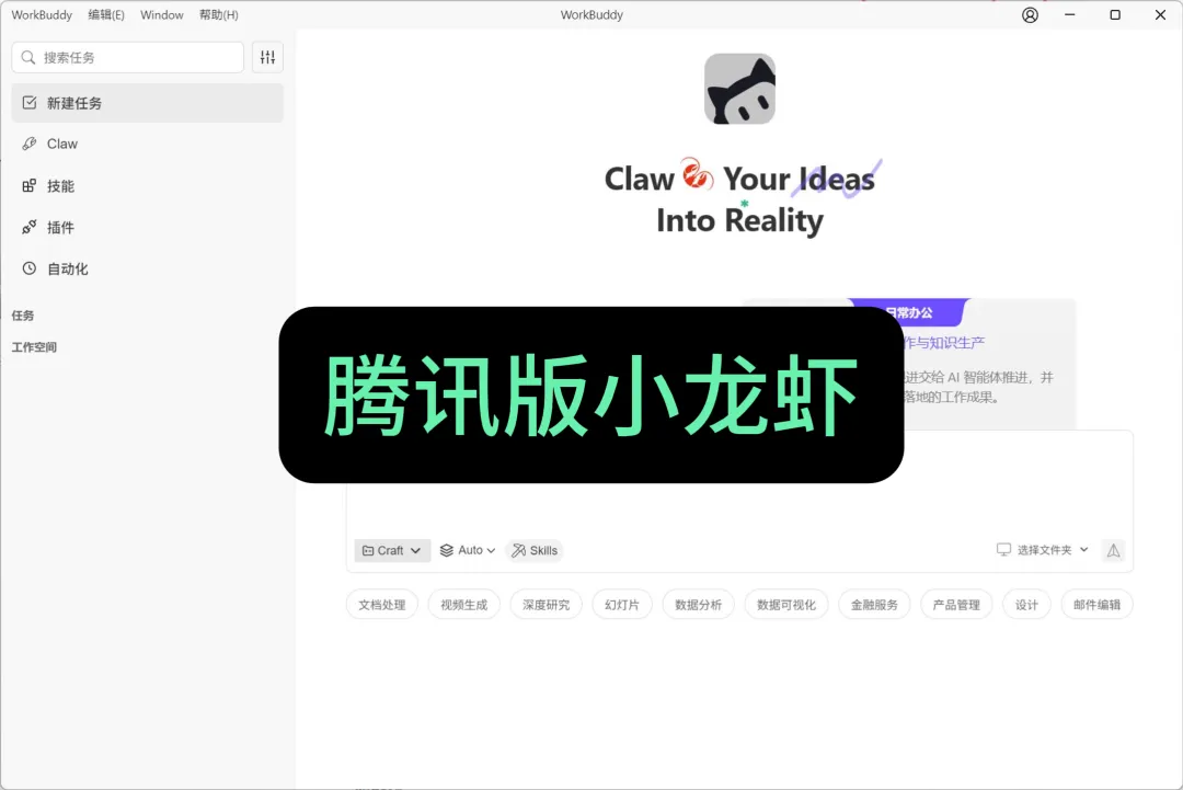 腾讯版OpenClaw | 1800字实操指南(喂饭级)大家好,我是爱玩AI的不正经绣才。最近火爆全网的OpenClaw,是技术党的狂欢,但对普通人非常不友好。为什么这么说呢?B站近百万播放的OpenClaw安装部署教程,长达10分钟,直接劝退小白。难道小白就不能养虾了吗?当然不是,其实腾讯刚上线的WorkBuddy,就完美解决了这个痛点,它兼容OpenClaw的所有Skills,无需复杂部署,接入微信也能一步搞定。说到这里,可能又有小白要迷糊了,OpenClaw、Skills到底是个啥。别担心!今天这篇近1800字实操指南📕,不光带大家轻松养虾,同时彻底搞懂那些AI新名词。01 OpenClaw是什么🤔介绍OpenClaw之前,我们必须知道智能体agent和技能Skills这两个概念。一句话解释(大白话)智能体:会思考,给信息给建议的一个专业小助手,如旅行规划师,客服助手等。技能:一个技能包,用于提升智能体的专业能力,如安装一个法律顾问Skills,那么智能体就拥有了专业律师的能力。OpenClaw:本质仍然是个AI智能体,但可以操作电脑直接交付任务,如发邮件、写文档、操作工具等。那OpenClaw跟小龙虾又有什么关系,为什么都说养虾呢?因为OpenClaw的logo是个红色卡通小龙虾,而Claw本意是爪子,意味着小龙虾可以自己上手操作电脑,更多的还是玩梗,也让大众更容易记住。养虾其实就是部署OpenClaw、接入大模型、安装技能等,打造一个专属的能真正干活的AI智能体。02 WorkBuddy实操指南📖简单介绍下WorkBuddy,工具定位和OpenClaw一样,兼容OpenClaw的所有技能,能操作电脑进行办公,并且无需部署,将养虾难度大幅度降低。▐ 安装WrokBuddy地址:https://www.codebuddy.cn/work/下载和电脑操作系统匹配的WorkBuddy,之后的安装和普通电脑软件一样简单。▐ 领取积分打开WorkBuddy,登录后点击右上角的图标,再点击积分余额,可以免费领取5000积分。▐ 功能介绍(核心)打开WorkBuddy后,搞懂左上角这些功能即可,下面我将一一介绍。新建任务点击新建任务按钮时,可以看到主界面有不少内容,可以分为7部分来看。第①部分:只用日常办公就好,代码开发不用去了解;第②部分:可以选择对话过程的上下文和上传附件用作参考;第③部分:当我们点击Craft时,可以看到三个选项:Craft、Plan、Ask.Craft:直接交付成品。Plan:给出详细的任务步骤。Ask:解决当前任务出现的问题。其实我们只用Craft就行,一样也能解决问题,其它两个可用可不用,适合更加专业的人士使用。第④部分:点击Auto时,可以看到多个大模型,选自己喜欢的,或者都不选;第⑤部分:选择合适的技能来完成任务,这里我还没有安装任何技能;第⑥部分:可以选择WorkBuddy的默认工作目录,也可以自己新建一个目录;第⑦部分:展示任务案例的,如果你不知道要干什么,可以选一个体验一下;Claw这个页面其实和新建任务一样,主要区别是Claw页面允许接入第三方工具,如微信、飞书等来远程操作WorkBuddy.技能强烈推荐安装find-skills这个技能,它可以帮助找到任务所需的技能,其他的按需安装。插件插件这块,小白直接跳过即可,这些不需要我们思考。自动化这块和定时任务一样,比较简单,后面会展示如何用的。▐ 新建任务测试任务一:批量处理图片格式(1)准备了一些书单图片;(2)选择工作目录和输入任务要求;(3)任务执行完毕;(4)图片已经批量修改为了png格式;任务二:安装python3建议把这个工具装上,因为WorkBuddy在操作办公软件时,基本上都会写python脚本。任务三:生成excel文件(1)输入任务要求;(2)任务执行完毕,可预览产物;(3)工作目录下已经生成了一个excel文件;(4)打开excel文件,效果很不错,还做了表格美化;任务四:将文档归类(1)输入任务要求;(2)任务执行完毕;(3)文档已经被分类整理;▐ 接入微信接入微信非常简单,仅需扫码就能完成。(1)点击Claw右侧的齿轮图标;(2)点击微信客服号集成右侧的配置;(3)微信扫码接入;(4)WorkBuddy绑定成功后,会给微信推送消息;然后就可以开始对话了,让它操作电脑工作。▐ 建立自动化任务(1)点击侧边栏的自动化,新建一个自动化任务;(2)到指定时间就会执行任务;03 结语✅本文展示了WorkBuddy的基础操作和简单案例,帮助小白快速上手。就我个人体验下来,感觉蛮强大的,只要安装合适的技能,建立一些自动化任务,可以极大提升工作和学习效率,让我们从重复劳动中解放出来,比如说,每天整理文件内容、收集各类资讯、发日报邮件等。当然,WorkBuddy的能力远不止文中展示的,有人甚至用它做出了可3D打印的汽车模型。虽然这类工具的褒贬不一,但技术本身没有对错,能体验下还是非常不错的,毕竟这会它们还是免费的。往期精选AI工具:👉ima知识库搭建 | 2400字实操指南(喂饭级)👉效率拉满!2026年必备的4款AI配音神器👉4款免费AI去水印工具!无需下载,直接用最后,如果你觉得这篇文章不错,记得点赞、转发、推荐或留言互动下,这样就不会错过下一篇文章了!