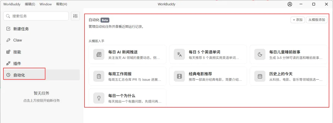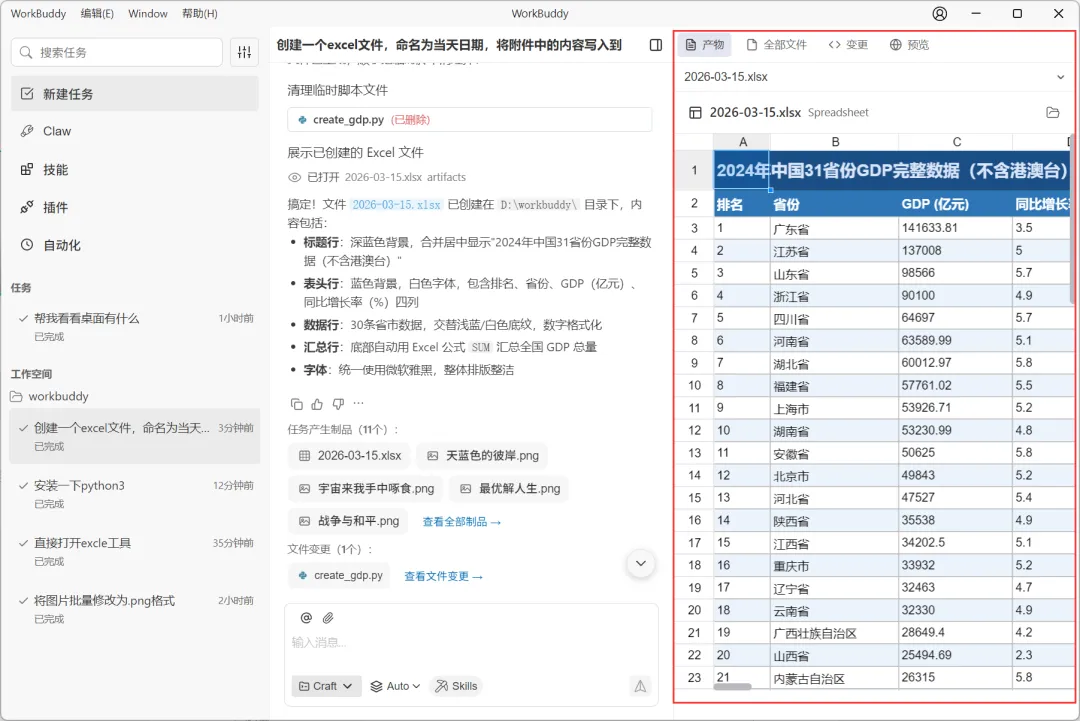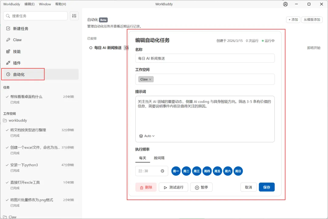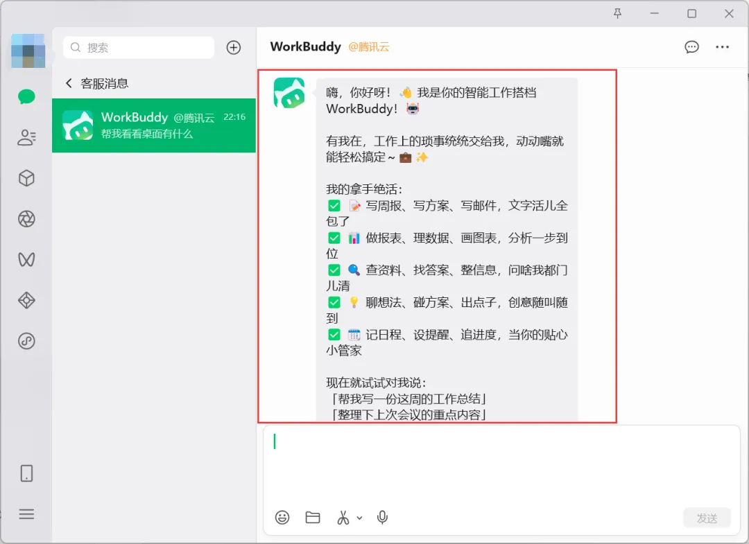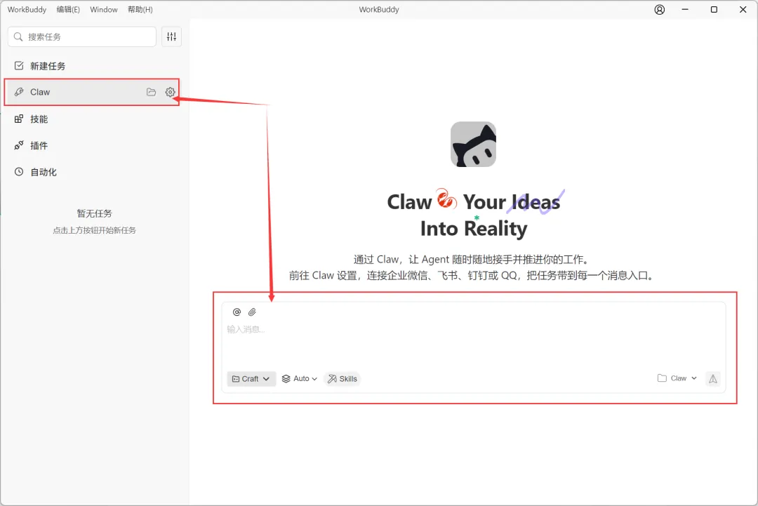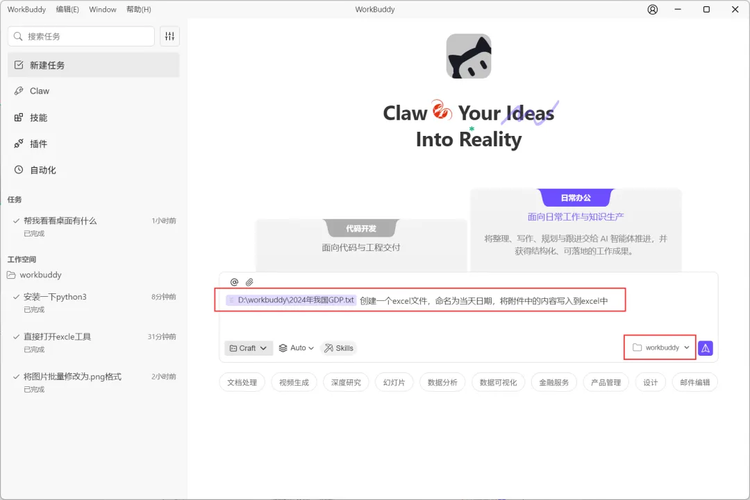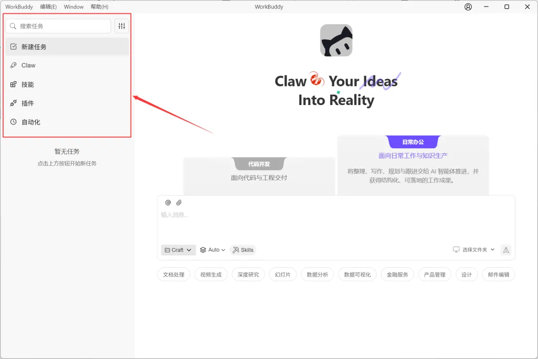 腾讯版OpenClaw | 1800字实操指南(喂饭级)大家好,我是爱玩AI的不正经绣才。最近火爆全网的OpenClaw,是技术党的狂欢,但对普通人非常不友好。为什么这么说呢?B站近百万播放的OpenClaw安装部署教程,长达10分钟,直接劝退小白。难道小白就不能养虾了吗?当然不是,其实腾讯刚上线的WorkBuddy,就完美解决了这个痛点,它兼容OpenClaw的所有Skills,无需复杂部署,接入微信也能一步搞定。说到这里,可能又有小白要迷糊了,OpenClaw、Skills到底是个啥。别担心!今天这篇近1800字实操指南📕,不光带大家轻松养虾,同时彻底搞懂那些AI新名词。01 OpenClaw是什么🤔介绍OpenClaw之前,我们必须知道智能体agent和技能Skills这两个概念。一句话解释(大白话)智能体:会思考,给信息给建议的一个专业小助手,如旅行规划师,客服助手等。技能:一个技能包,用于提升智能体的专业能力,如安装一个法律顾问Skills,那么智能体就拥有了专业律师的能力。OpenClaw:本质仍然是个AI智能体,但可以操作电脑直接交付任务,如发邮件、写文档、操作工具等。那OpenClaw跟小龙虾又有什么关系,为什么都说养虾呢?因为OpenClaw的logo是个红色卡通小龙虾,而Claw本意是爪子,意味着小龙虾可以自己上手操作电脑,更多的还是玩梗,也让大众更容易记住。养虾其实就是部署OpenClaw、接入大模型、安装技能等,打造一个专属的能真正干活的AI智能体。02 WorkBuddy实操指南📖简单介绍下WorkBuddy,工具定位和OpenClaw一样,兼容OpenClaw的所有技能,能操作电脑进行办公,并且无需部署,将养虾难度大幅度降低。▐ 安装WrokBuddy地址:https://www.codebuddy.cn/work/下载和电脑操作系统匹配的WorkBuddy,之后的安装和普通电脑软件一样简单。▐ 领取积分打开WorkBuddy,登录后点击右上角的图标,再点击积分余额,可以免费领取5000积分。▐ 功能介绍(核心)打开WorkBuddy后,搞懂左上角这些功能即可,下面我将一一介绍。新建任务点击新建任务按钮时,可以看到主界面有不少内容,可以分为7部分来看。第①部分:只用日常办公就好,代码开发不用去了解;第②部分:可以选择对话过程的上下文和上传附件用作参考;第③部分:当我们点击Craft时,可以看到三个选项:Craft、Plan、Ask.Craft:直接交付成品。Plan:给出详细的任务步骤。Ask:解决当前任务出现的问题。其实我们只用Craft就行,一样也能解决问题,其它两个可用可不用,适合更加专业的人士使用。第④部分:点击Auto时,可以看到多个大模型,选自己喜欢的,或者都不选;第⑤部分:选择合适的技能来完成任务,这里我还没有安装任何技能;第⑥部分:可以选择WorkBuddy的默认工作目录,也可以自己新建一个目录;第⑦部分:展示任务案例的,如果你不知道要干什么,可以选一个体验一下;Claw这个页面其实和新建任务一样,主要区别是Claw页面允许接入第三方工具,如微信、飞书等来远程操作WorkBuddy.技能强烈推荐安装find-skills这个技能,它可以帮助找到任务所需的技能,其他的按需安装。插件插件这块,小白直接跳过即可,这些不需要我们思考。自动化这块和定时任务一样,比较简单,后面会展示如何用的。▐ 新建任务测试任务一:批量处理图片格式(1)准备了一些书单图片;(2)选择工作目录和输入任务要求;(3)任务执行完毕;(4)图片已经批量修改为了png格式;任务二:安装python3建议把这个工具装上,因为WorkBuddy在操作办公软件时,基本上都会写python脚本。任务三:生成excel文件(1)输入任务要求;(2)任务执行完毕,可预览产物;(3)工作目录下已经生成了一个excel文件;(4)打开excel文件,效果很不错,还做了表格美化;任务四:将文档归类(1)输入任务要求;(2)任务执行完毕;(3)文档已经被分类整理;▐ 接入微信接入微信非常简单,仅需扫码就能完成。(1)点击Claw右侧的齿轮图标;(2)点击微信客服号集成右侧的配置;(3)微信扫码接入;(4)WorkBuddy绑定成功后,会给微信推送消息;然后就可以开始对话了,让它操作电脑工作。▐ 建立自动化任务(1)点击侧边栏的自动化,新建一个自动化任务;(2)到指定时间就会执行任务;03 结语✅本文展示了WorkBuddy的基础操作和简单案例,帮助小白快速上手。就我个人体验下来,感觉蛮强大的,只要安装合适的技能,建立一些自动化任务,可以极大提升工作和学习效率,让我们从重复劳动中解放出来,比如说,每天整理文件内容、收集各类资讯、发日报邮件等。当然,WorkBuddy的能力远不止文中展示的,有人甚至用它做出了可3D打印的汽车模型。虽然这类工具的褒贬不一,但技术本身没有对错,能体验下还是非常不错的,毕竟这会它们还是免费的。往期精选AI工具:👉ima知识库搭建 | 2400字实操指南(喂饭级)👉效率拉满!2026年必备的4款AI配音神器👉4款免费AI去水印工具!无需下载,直接用最后,如果你觉得这篇文章不错,记得点赞、转发、推荐或留言互动下,这样就不会错过下一篇文章了!