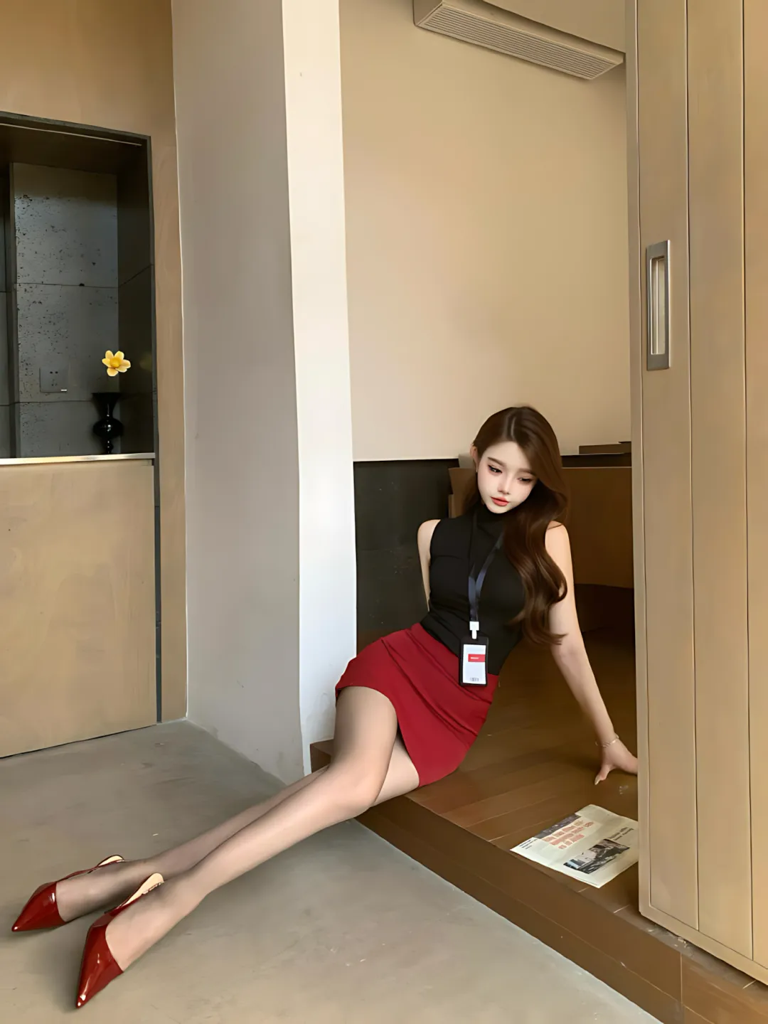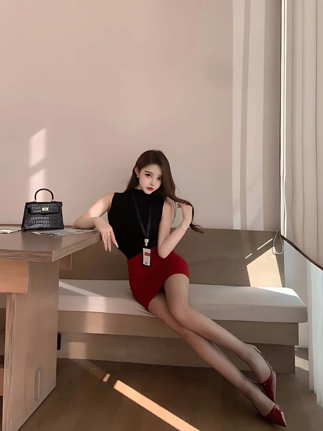 下装:惹火酒红高腰裹臀裙 黑红配色永远的神!这个红不是那种咋呼的亮红,而是自带王家卫电影滤镜的浓郁酒红。包裹感顺到离谱,把臀胯比勾勒得简直绝绝子,随便往墙边一靠,那个S曲线谁看了不迷糊?