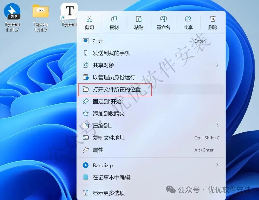 12、回到桌面,右键桌面上的【Typora软件图标】,点击【打开文件所在的位置】
