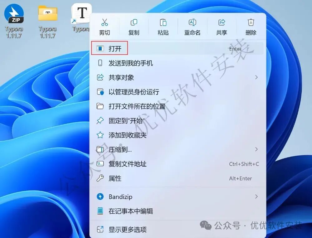 15、回到桌面,右键桌面上的【Typora软件图标】,点击【打开】