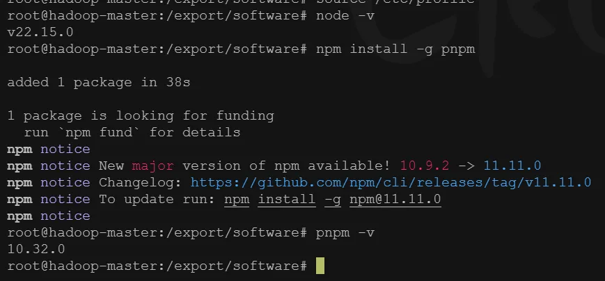 vi /etc/profile export NODE_HOME=/export/software/node-v22 export export PATH=$NODE_HOME/bin:$PATH 执行 source /etc/profile |