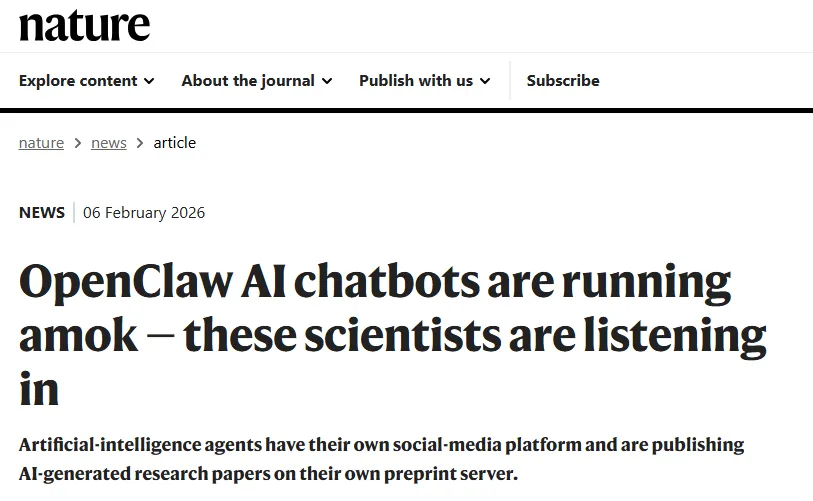 2026 年 2 月 6 日,一篇题为OpenClaw AI chatbots are running amok—these scientists are listening in的报道刊发于 Nature 正刊(Nature 650, 533–534),DOI:10.1038/d41586-026-00370-w,让开源自主 AI 智能体 OpenClaw 从技术社区走向全球学术视野。这篇报道并非传统研究论文,而是 Nature 新闻团队联合多所高校 AI 安全实验室完成的现象级深度调查,系统呈现了自主 AI 从工具走向自主社交、自主 “科研” 的真实图景,也为学术界敲响了安全与伦理的警钟。