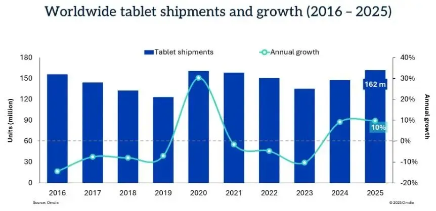 全球平板电脑市场在2025年持续复苏,根据Omdia的最新研究,出货量同比增长9.8%,达到1.62亿台。增长势头在假日季最为强劲,2025年第四季度出货量达到4400万台,同比增长9.8%。