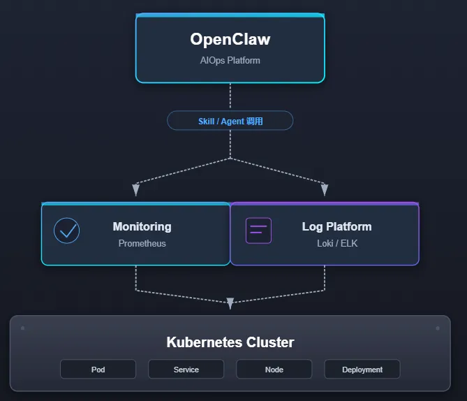 OpenClaw作为智能运维入口,通过Skill调用Kubernetes、Prometheus、日志系统等能力,实现智能运维。