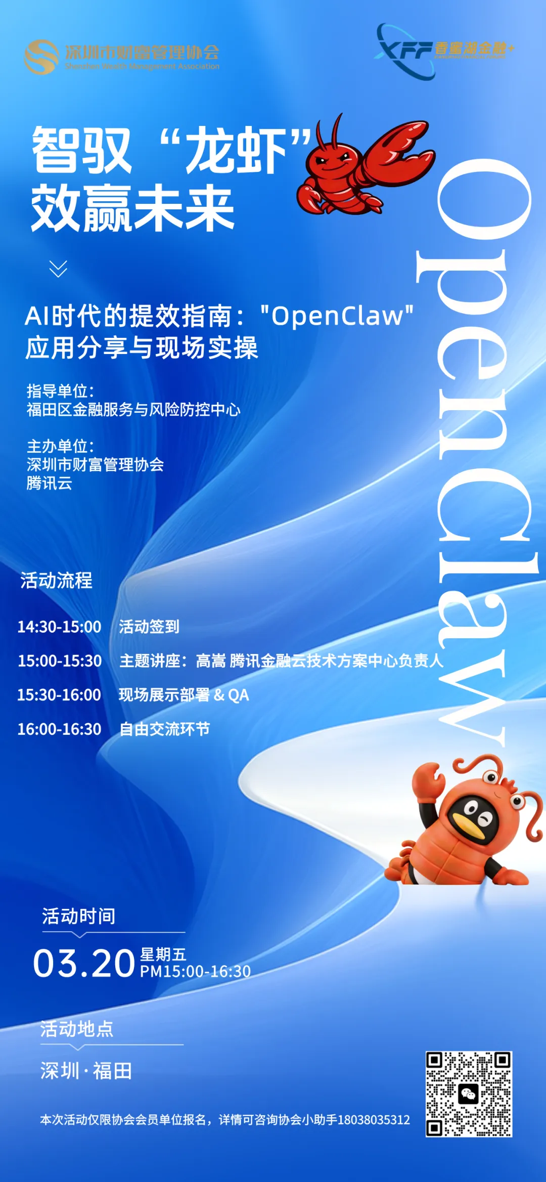 活动预告丨AI时代的提效指南:“OpenClaw”应用分享与现场实操深圳市财富管理协会于2024年6月27日成立,是根据《关于加快建设深圳国际财富管理中心的意见》成立的跨行业的专业服务协会,业务主管单位是中共深圳市委金融委员会办公室,登记管理机关是深圳市民政局,由招银理财、东方富海、平安理财、建信理财、博时基金、南方基金、中信证券、国信证券 8 家单位共同发起,汇聚了银行理财、银行、保险资管、保险、证券、证券资管、信托、期货、公募基金、创投基金、私募证券基金、第三方销售公司、法税机构和个人、高校科研机构、非营利组织和媒体等多种类型的会员机构。
