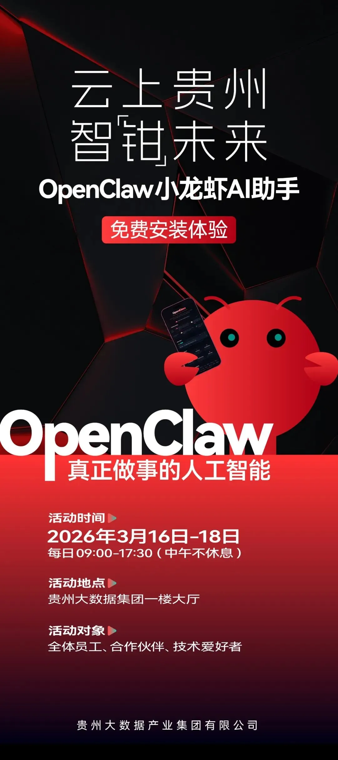 据悉,本次 OpenClaw 免费安装体验活动于3月16日至18日持续开展,欢迎广大合作伙伴、技术爱好者积极参与。贵州大数据集团党委委员、副总经理张宇表示,此次活动不仅推广了OpenClaw开源AI技术,更搭建了高效的技术交流平台,助力培育本地人工智能产业生态。本次活动只是开端,下一步集团将建立常态化技术服务机制,定期举办技术沙龙与专题培训,持续推动行业先进AI技术在贵州落地应用、赋能千行百业,切实为贵州经济社会高质量发展注入新动能。