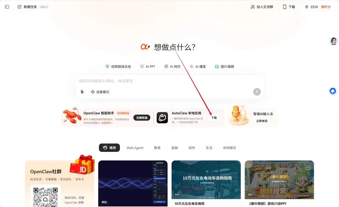 在官网下载安装后,直接输入指令就能让龙虾干活,还能接入飞书等即时通讯工具。