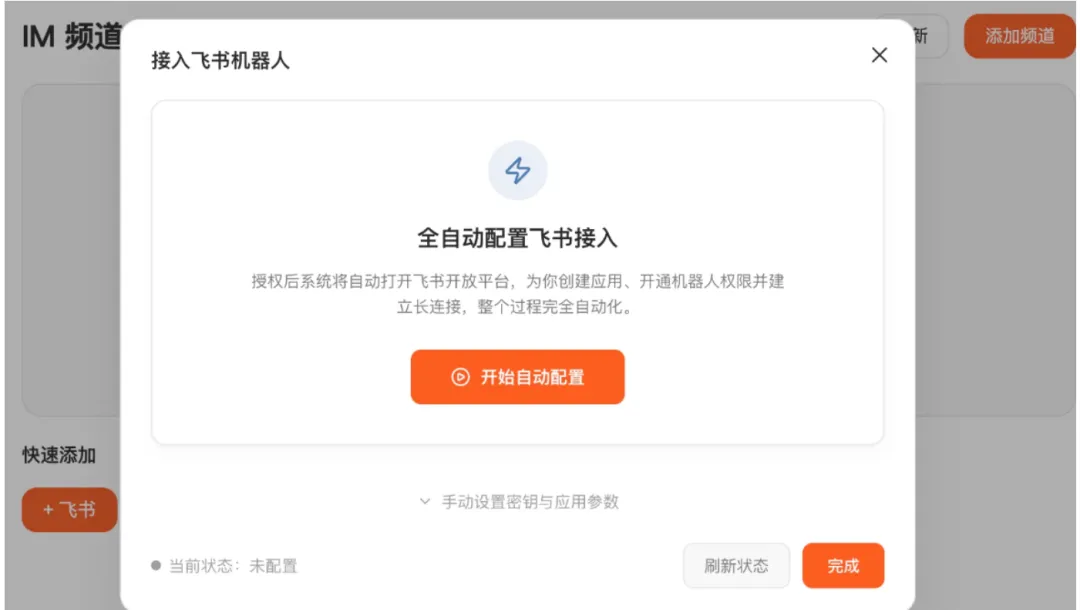 他会要求你进行授权,登录你自己的飞书账号,然后到飞书开放平台,创建企业应用