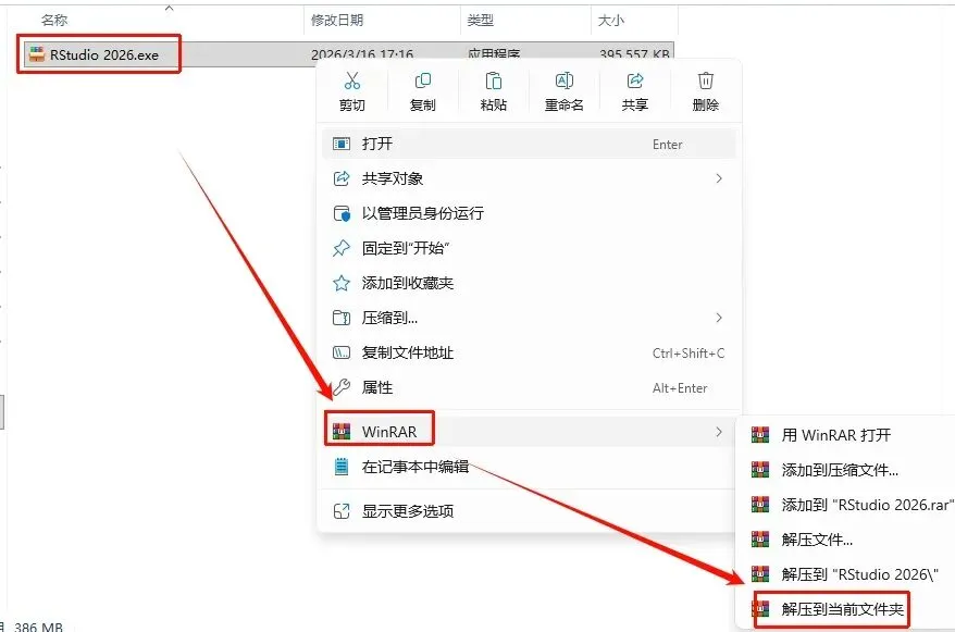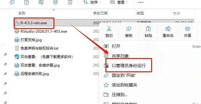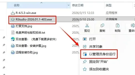 12.返回刚刚解压的“RStudio 2026“文件夹,鼠标右键”RStudio-2026.01.1-403.exe”选择“以管理员身份运行”