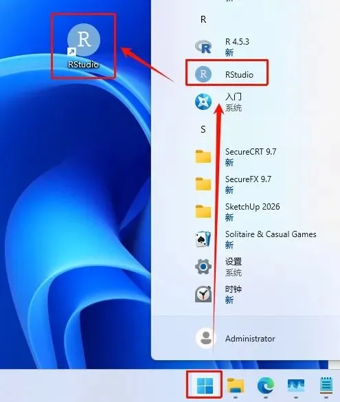 17.点击“开始“菜单栏,点击“所有应用“,找到“RStudio“软件,鼠标左键拖拽到桌面上即可创建桌面快捷方式