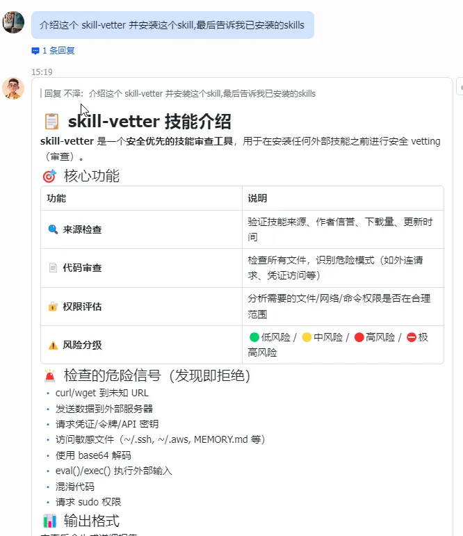 既然 OpenClaw 已经部署完成,飞书机器人也已就绪,我们直接让 AI 告诉我们 skill-vetter 是做什么的,并帮忙安装。