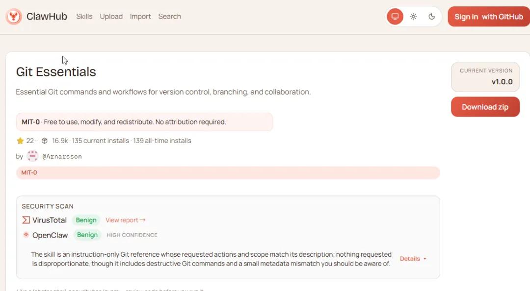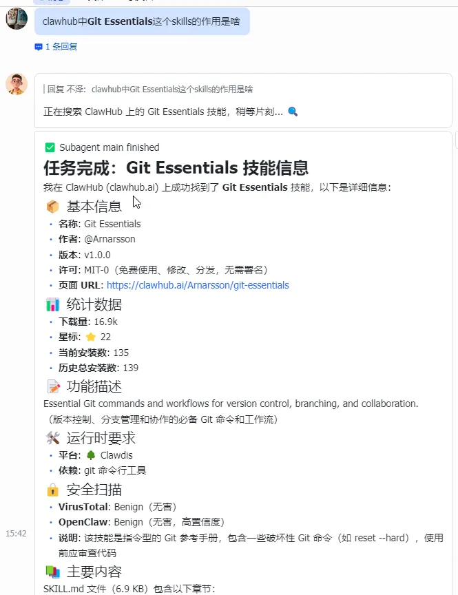 我去 ClawHub 上搜索了一下,找到了一个 Git 相关的 Skills: