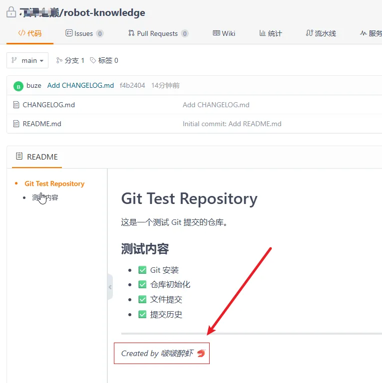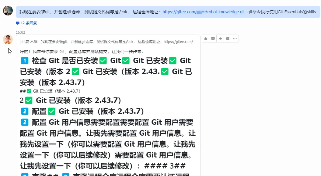 “我现在要安装 git,并创建 git 仓库,测试提交代码等是否 ok,远程仓库地址:https://gitee.com/xxx/robot-knowledge.git
