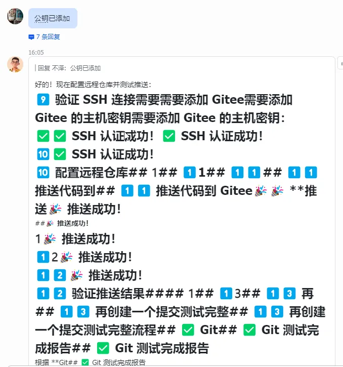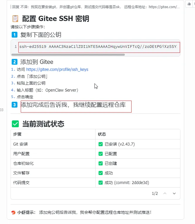 AI 会生成 SSH 公钥,并指导你添加到 Gitee:
