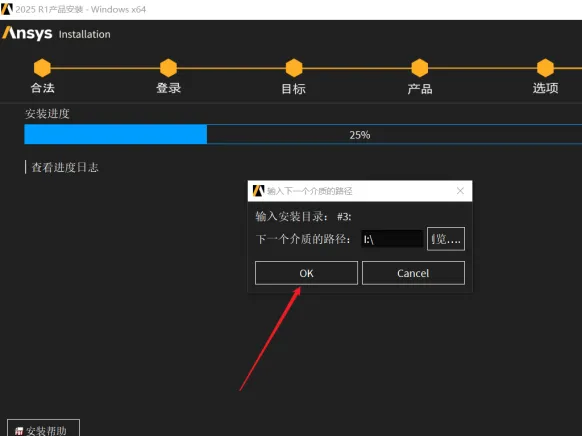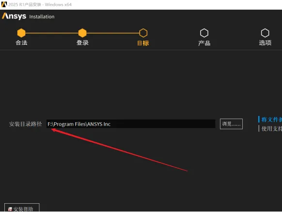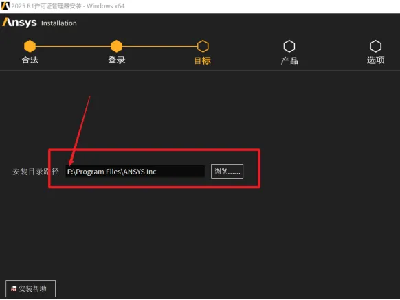 8.在【目标】界面中,修改路径地址中的第一个字符C可更改安装位置(如:把C改为D软件将安装到D盘,这里根据大家实际的安装路径进行更改,请注意如果之前安装过ansys则无法改动,详情请见公共号内的卸载文章),点击【下一步】。