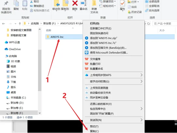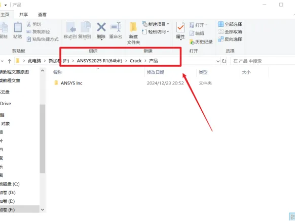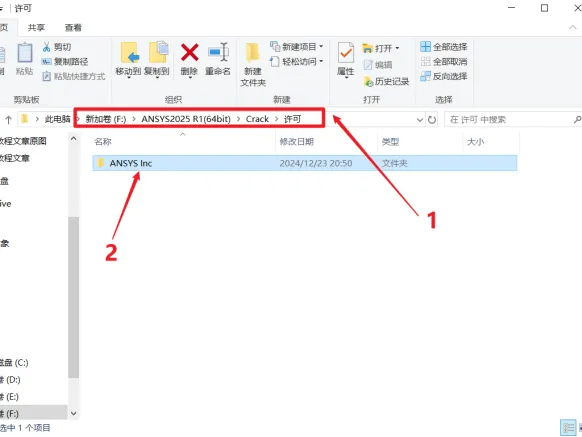 14. 打开安装包解压后的【ANSYS 2025 R1(64bit)】文件夹,依次打开【Crack\许可】文件夹,鼠标右击【ANSYS Inc】选择【复制】。