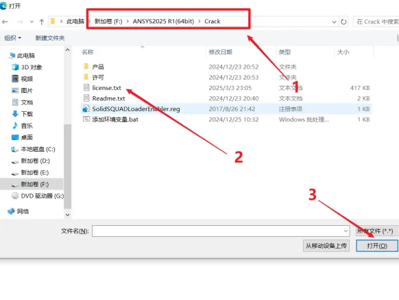 23.选择安装包解压后的【ANSYS2025 R1(64bit)】文件夹中【Crack】文件夹下的【license】,点击【打开】。