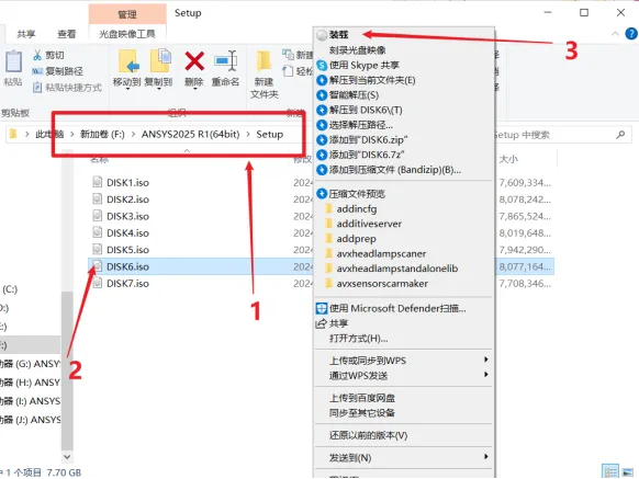 43.打开安装包解压后的【ANSYS 2025 R1(64bit)】文件夹中【Setup】文件夹,鼠标右击【DISK3】选择【装载】(注意留意装置后的磁盘符,在步骤46将会选择SIDK2装载的磁盘,不同用户这里装置之后磁盘符可能不一致