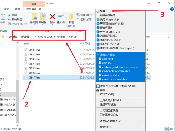 50. 打开安装包解压后的【ANSYS 2025 R1(64bit)】文件夹中【Setup】文件夹,鼠标右击【DISK7】选择【装载】。