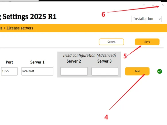 65. 配置Enabled:①点击【Enabled】开关②输入”Port 【1055】"Server"【localhost】③点击【Test】④点击【Save】⑤点击右上角【X】关闭。