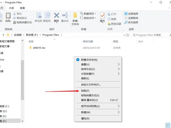 15.打开许可安装路径【D:\Program Files】(如您在步骤8修改为其他位置,选择对应位置打开),鼠标右击空白处选择【粘贴】。