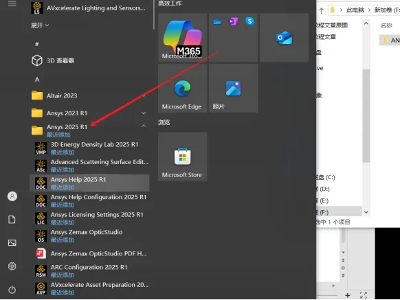 ①如创建【Workbench】桌面快捷方式:点击桌面任务栏中的【开始图标】>双击展开【ANSYS 2025R1】文件夹。