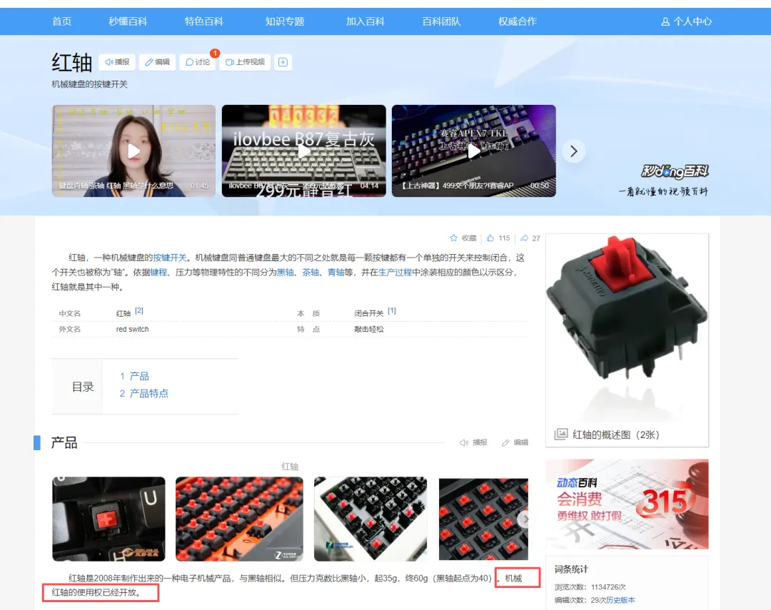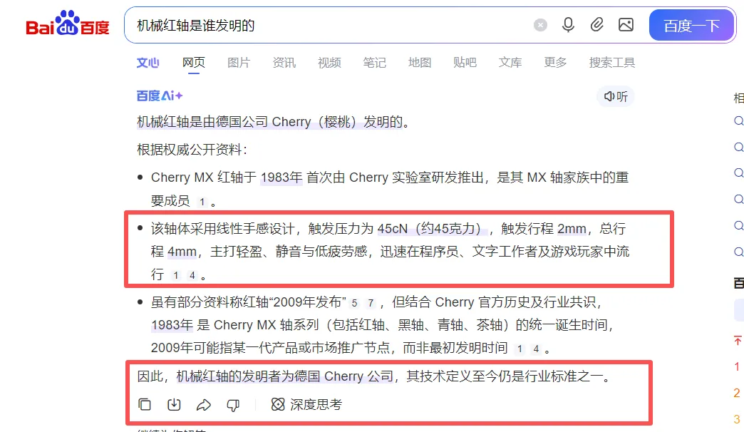 那么再回到键盘领域呢…百度百科,通常也是现代的互联网版“史记”,真的,百度不出来,你会用deepseek,你喜欢用grok,或者是你喜欢用自己的小龙虾,总而言之,你搜出来的每一个关于红轴的论述,都是来自于德国樱桃。