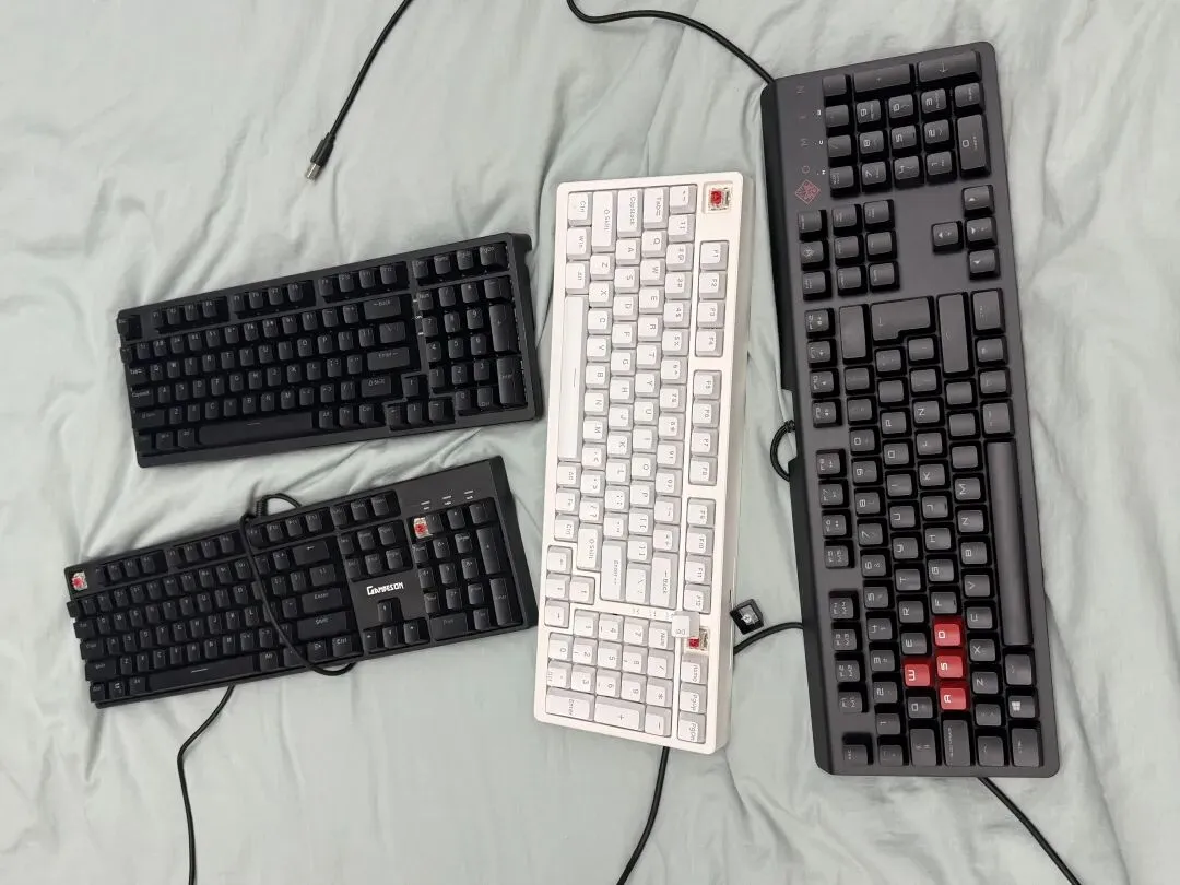 再一个,小编给秋名山测了无数的键盘,大家还记得山上推荐了秀育红轴,赞扬了其一线高贵做工,也试了同厂出品的wooting平替,在2017年时小编几乎迷上了最初的DAS4带来的指尖高潮,也用废了了Filco的红轴,推过AOC联想传统大牌的新旗舰,也推荐过新兴的狼蛛这类品牌的新品,而且每日打字都在20000字以上,对键盘手感的理解还算是可以,我们可以简单进行一下比对。(今天真的有点纳闷,随手从柜子里掏出5把红轴,有几个cherry自己的、FILCO的在办公场所放着用着了)