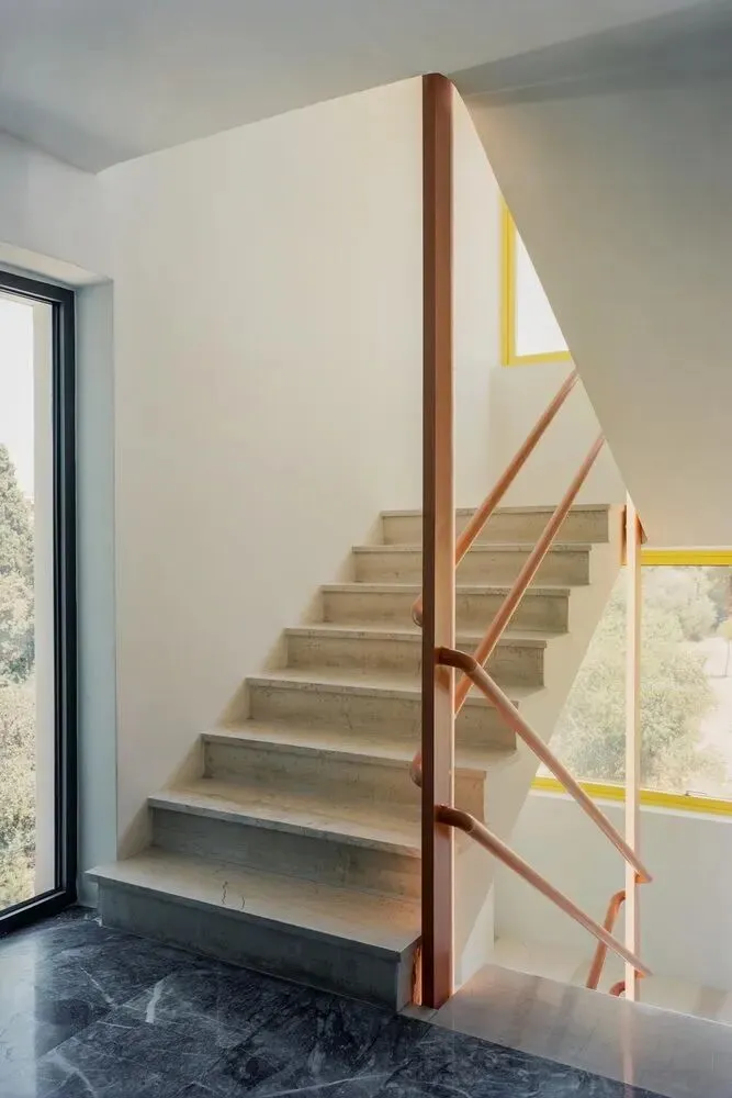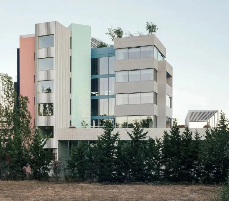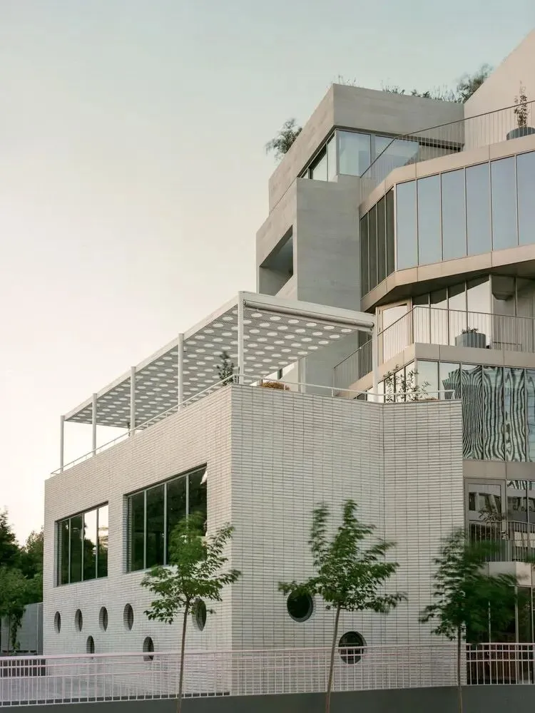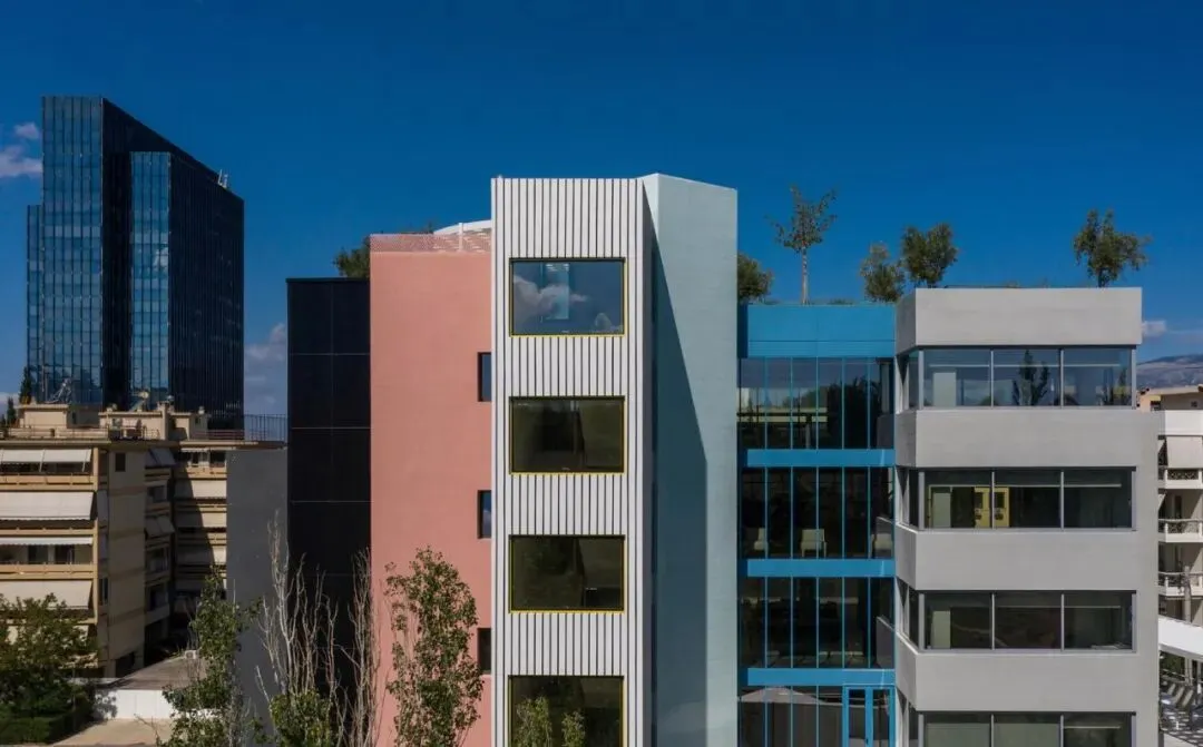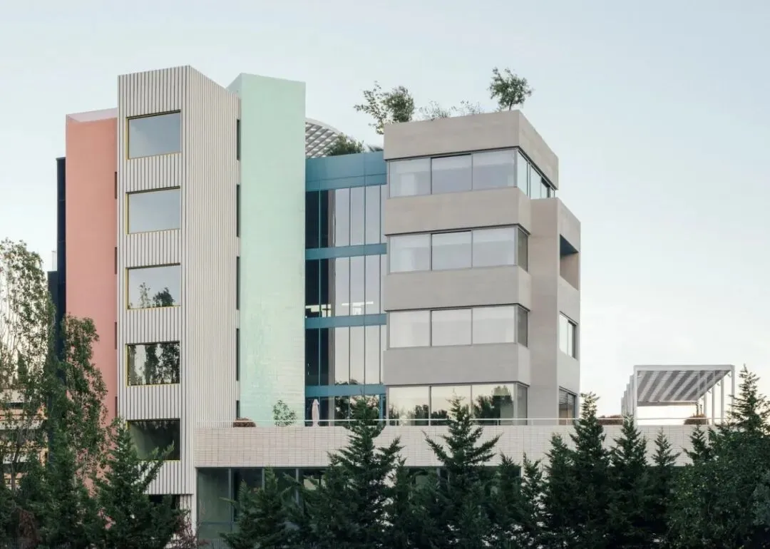 多层办公建筑设计:希腊 Art 1 Office/旧改设计:Neiheiser Argyros这座已有40年历史的办公楼被剥离至原始结构,并针对当下需求进行了彻底重塑。原有的体量逻辑得以恢复并强化。曾经几何形状冲突、混乱破败的建筑,如今被梳理清晰,重新构建,仿佛由十二座独立建筑组成,每座建筑都有其独特的外立面逻辑和内部氛围,面积2300㎡。建筑正面采用更为低调的材质表达,以白色、灰色、黑色和金色的微妙色彩变化为特色。覆盖最高正面体量的新幕墙,与宽敞的现浇水磨石台阶相得益彰,清晰地标示出正门入口。建筑背面则采用了更为活泼的色彩搭配。建筑重新定位,以充分利用其毗邻自然公园的优越位置,在原有实墙上开凿出大型开口,不仅拓宽视野,还引入更多自然光,弥补了建筑原有低矮天花板的不足。建筑顶部设有绿色屋顶和圆形凉棚,提供了小型的户外遮阳工作空间,以及一个酒吧和一个大型活动空间,鼓励新的交流与对话形式。建筑融入了一系列可持续性策略 —— 高性能保温材料和窗户、使用当地天然材料、低能耗机电系统、充电站和自行车停放区,以及集成光伏板,并荣获当地 A+ 级最高能效等级。 end