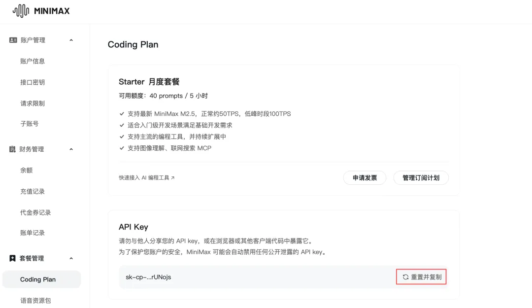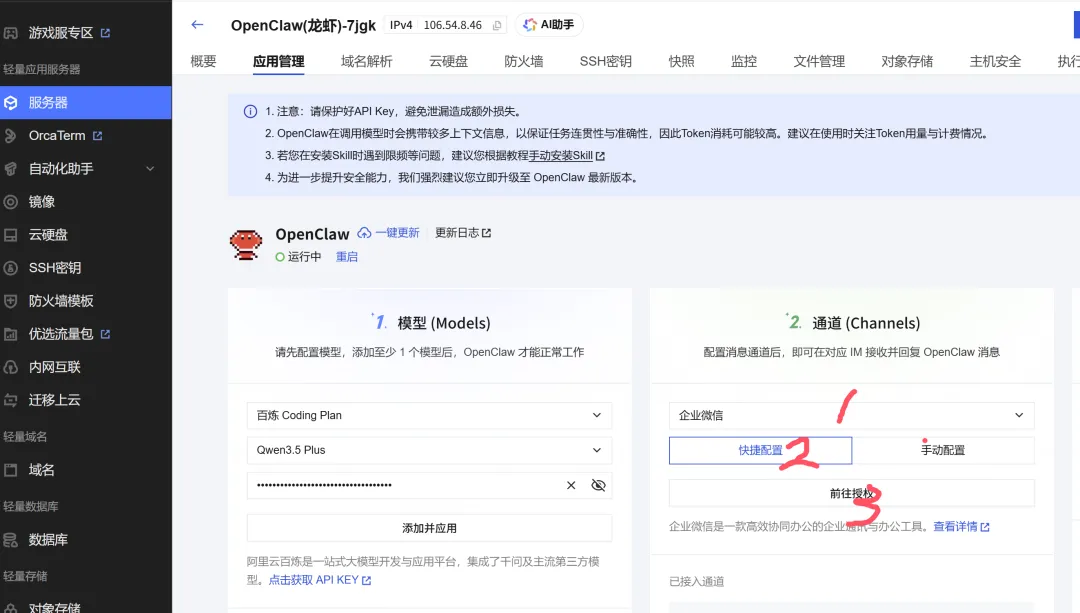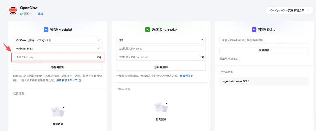 (1)第一个下下拉框先择具体模型厂家,一个是API(直接调用计费),一个是coding plan(包月或者包年),建议选coding plan,消耗不起,具体对比见模型的选择(2)该下拉框也可以选择其他厂家的大模型,扣款只跟第一个下拉框的厂家对应(3)获取API Key,点击下图箭头位置——开放平台注册登录位置——新用户需要获取key,直接复制API(密钥)Key,在第三行粘贴(4)点击添加应用,在最下面就会出现你的算力模型,可以添加多个,随意切换首先您需要购买MiniMax Coding Plan套餐 https://platform.minimaxi.com/user-center/basic-information/interface-key购买套餐成功后,进入MiniMax Coding Plan的API Key管理页(https://platform.minimaxi.com/user-center/payment/coding-plan,注意Coding Plan的API Key和普通的API Key相互独立),点击页面内的重置并复制按钮,复制API Key。(注意:请妥善保存模型API Key,避免泄露。)复制API Key之后,回到轻量应用服务器应用管理页面,选择MiniMax(国内-Coding Plan),并选择模型版本(如MiniMax M2.1),将复制好的API Key粘贴进面板的“API Key”输入框,点击添加并应用按钮保存模型API Key配置。同样稍等片刻,出现“模型添加应用成功”的提示,此时模型配置的页签中将会新增一条模型配置,并处于“应用中”状态,即代表模型的API Key配置成功。配置通道(在哪对话)