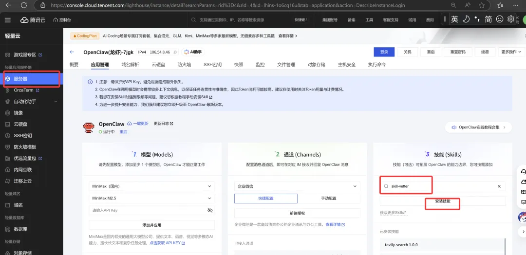 你要:写文章 + 配图 + 视频 + OpenClaw 自动化 → 选 火山方舟(40 元)你要:速度最快、批量日更多、不心疼图视频 → 选 MiniMax(98 元)我的选择其实是阿里云百炼,毕竟是国内技术流的代表,但是codingplan实在是抢不到,新手可以考虑入手minimax plus版(49)三、腾讯云Open Claw安装及设置