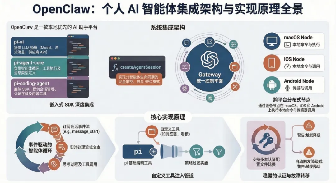 这种嵌入式设计让 OpenClaw 既保留了 pi 的强大编码与工具能力,又实现了本地零延迟和精细控制。