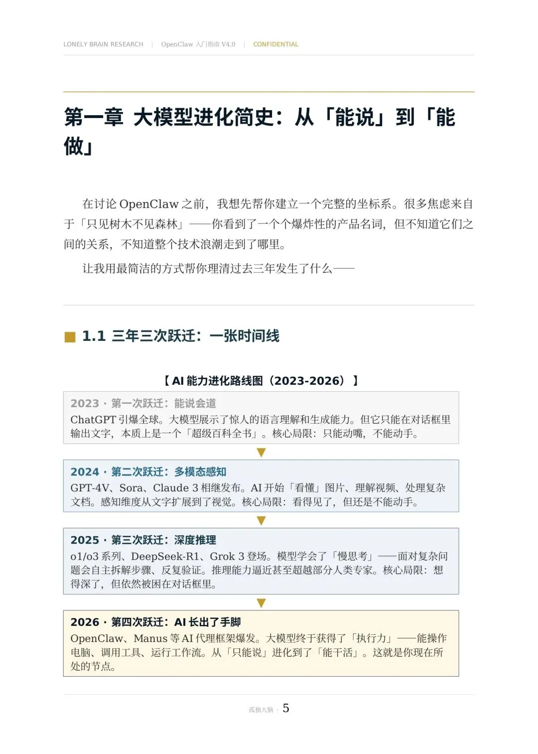 首先得搞明白,OpenClaw到底解决了什么问题?报告里有个比喻很到位:如果大模型是大脑,OpenClaw就是给大脑装上的手脚和神经系统。过去三年,AI经历了「能说会道」→「多模态感知」→「深度推理」三次跃迁,但始终被困在对话框里。2026年的第四次跃迁,就是AI终于能「动手干活」了——操作电脑、调用工具、运行工作流。这叫从对话到执行的维度跨越。