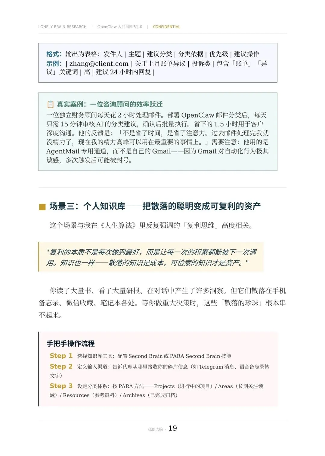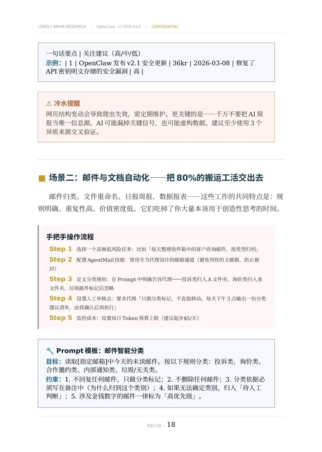 那它适合干什么?不是取代你的深度思考,而是吃掉那些「高度结构化、SOP明确、错误可逆」的重复劳动。报告估算,80%的这类工作可以被替代。比如晨间情报抓取、邮件自动分类、碎片知识结构化、投研周报初稿——这些活儿规则清楚、价值密度低,交给AI代理,相当于招了个24小时在线的「超级实习生」。