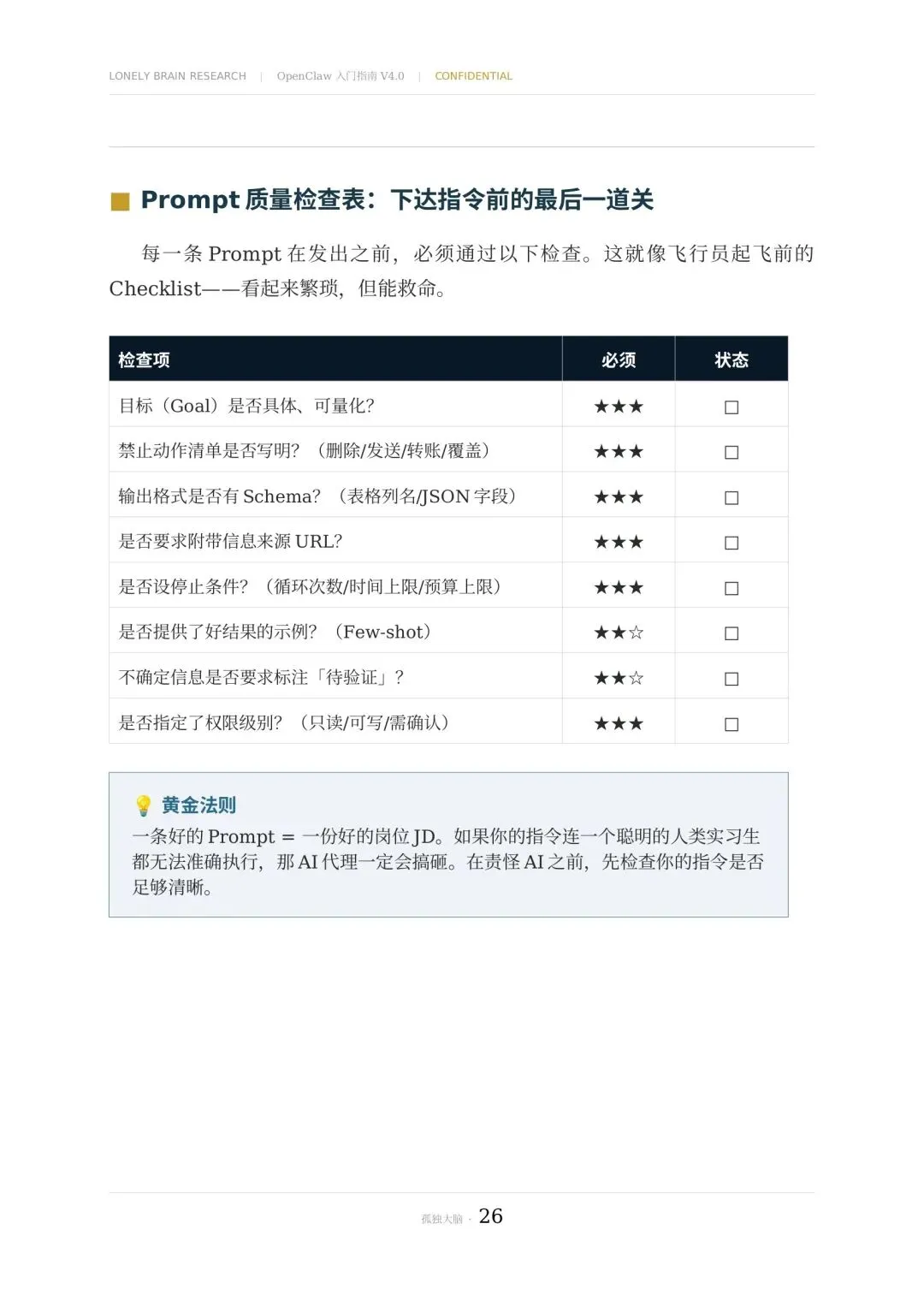 所以核心思维转换是:写「岗位说明书」,而不是「愿望清单」。你想要什么不关键,关键是告诉它做什么、不做什么、怎么验收、何时停机。越像正式的JD,AI表现越稳定。