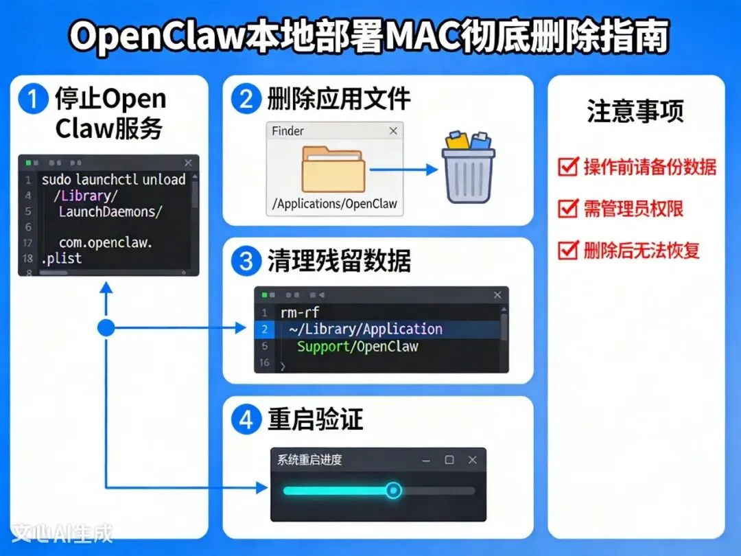 # 1. 停止所有可能正在运行的 OpenClaw 进程pkill -f openclawpkill -f "node.*openclaw"# 2. 卸载全局 npm 包 (防止版本冲突)npm uninstall -g openclaw 2>/dev/null || true# 3. 删除主配置和数据目录 (这是最关键的)rm -rf ~/.openclaw# 4. 删除可能的缓存和日志残留rm -rf ~/Library/Caches/openclawrm -rf ~/Library/Logs/openclaw# 5. 删除 LaunchAgent (如果有残留的启动项)rm -f ~/Library/LaunchAgents/ai.openclaw.gateway.plistlaunchctl bootout gui/$(id -u)/ai.openclaw.gateway 2>/dev/null || truelaunchctl remove ai.openclaw.gateway 2>/dev/null || true# 6. 【关键】清理 npm 的全局缓存 (防止损坏的包被复用)npm cache clean --force# 7. 回到一个绝对安全的目录 (避免之前的 getcwd 错误)cd ~