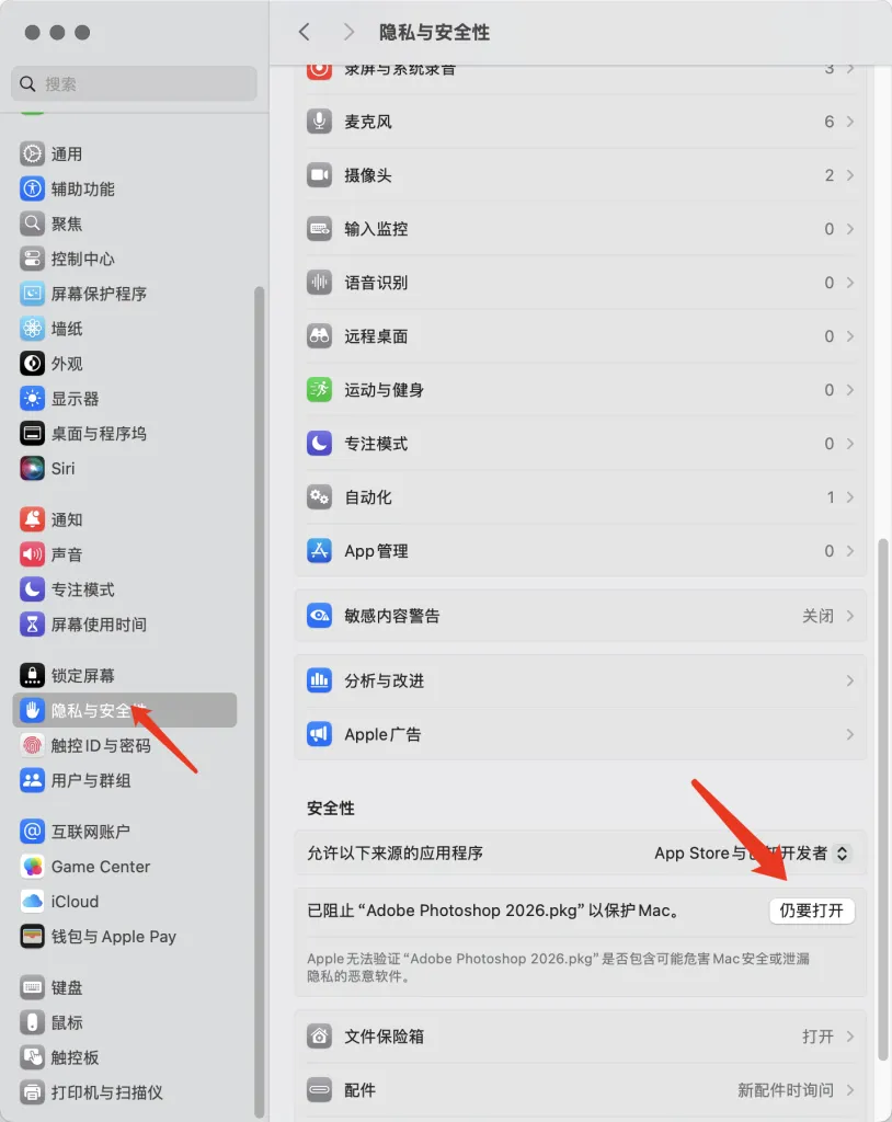 第三,如果弹出这样,就是电脑有权限,去系统设置上点隐私安全点击要打开(MAc系统权限问题和软件无关)。