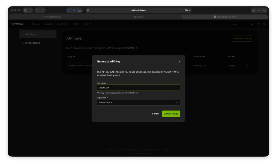 打开网址:https://build.nvidia.com/settings/api-keys 创建Key(需要绑定手机号才能创建,+86的手机号可以绑定),设置Key的有效期,推荐Never Expire,永不过期。