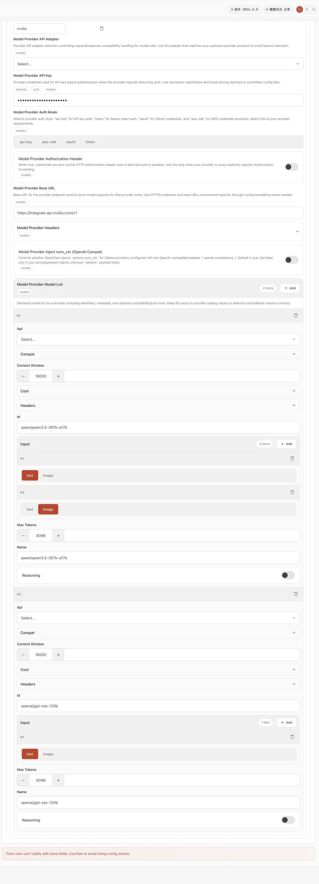 nvidia: {baseUrl: 'https://integrate.api.nvidia.com/v1',apiKey: '填入你自己的API Key',api: 'openai-completions',models: [{id: 'qwen/qwen3.5-397b-a17b',name: 'qwen/qwen3.5-397b-a17b',api: 'openai-completions',reasoning: false,input: ['text','image',],cost: {input: 0,output: 0,cacheRead: 0,cacheWrite: 0,},contextWindow: 16000,maxTokens: 4096,},{id: 'openai/gpt-oss-120b',name: 'openai/gpt-oss-120b',api: 'openai-completions',reasoning: false,input: ['text',],cost: {input: 0,output: 0,cacheRead: 0,cacheWrite: 0,},contextWindow: 16000,maxTokens: 4096,},],},