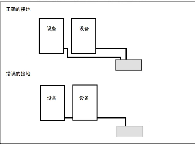 禁止按照下图所示方法进行接地。请确保各个设备独立接地。