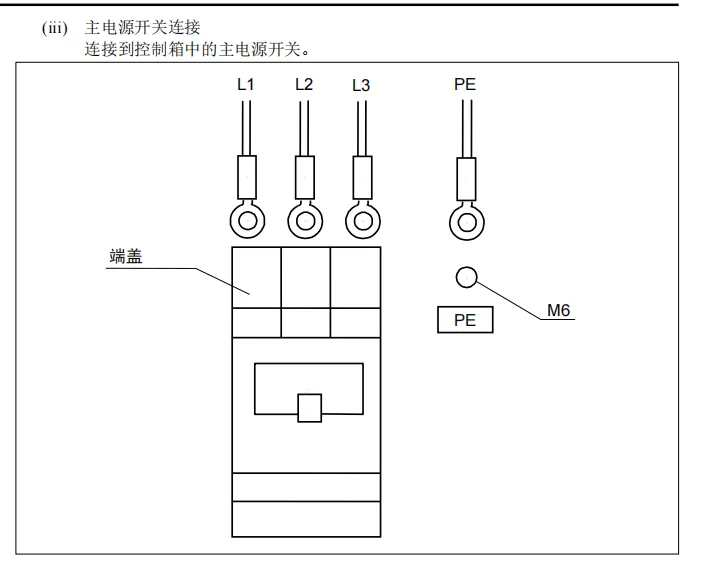 牢牢固定电源线,但确保不会在主电源开关连接上施加外力。使用扎带将电源线固定在控制箱内右侧的指定点中的电源线固定点。关闭并固定线缆,使电缆入口不存在缝隙。设置接线和线缆后,将端盖安装在主电源开关上。
