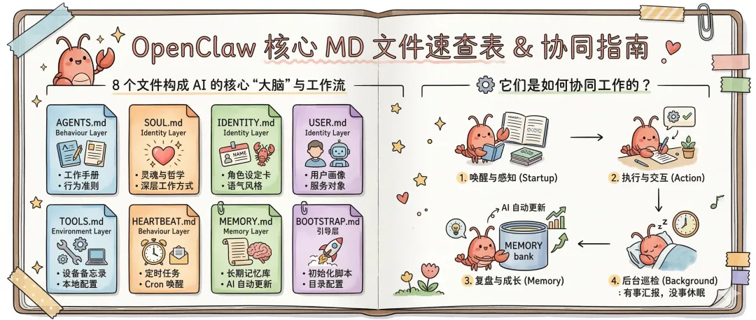 OpenClaw 的 MD 文件系统是其“本地优先、透明可控”理念的完美体现。通过这 8 个核心文件,你可以像管理代码一样管理 AI 代理的“大脑”:
