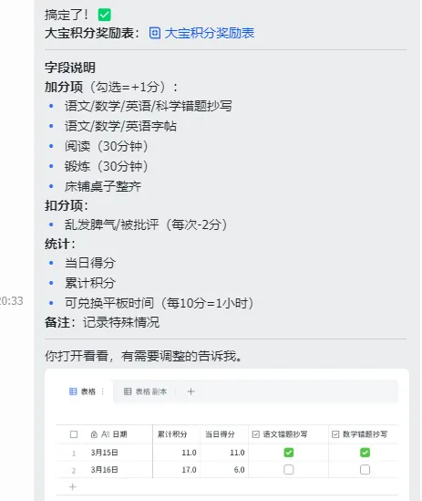 ✅ 错题抄写加1分✅ 写字帖加1分✅ 阅读30分钟加1分✅ 锻炼30分钟加1分✅ 床铺整齐加1分❌ 乱发脾气扣2分今天我直接语音让小龙虾帮我建了一个飞书多维表格,把所有字段都设好了。然后我发语音给他:"3月16号,床铺整齐加1分。"之前用嘴P图,现在用嘴做表格,写文档。不得不感慨这发展速度啊!#OpenClaw #AI助手 #飞书 #飞书表格 #效率工具 #产品经理 #AI实践