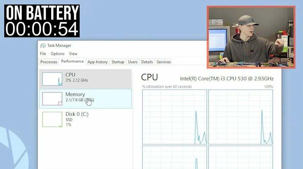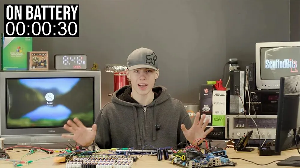 国外 YouTuber ScuffedBits 之前就试过用 AA 电池给电脑供电,不过当时的结果并不理想,电脑只能短暂运行,大概 2 分钟左右就把电耗光了。